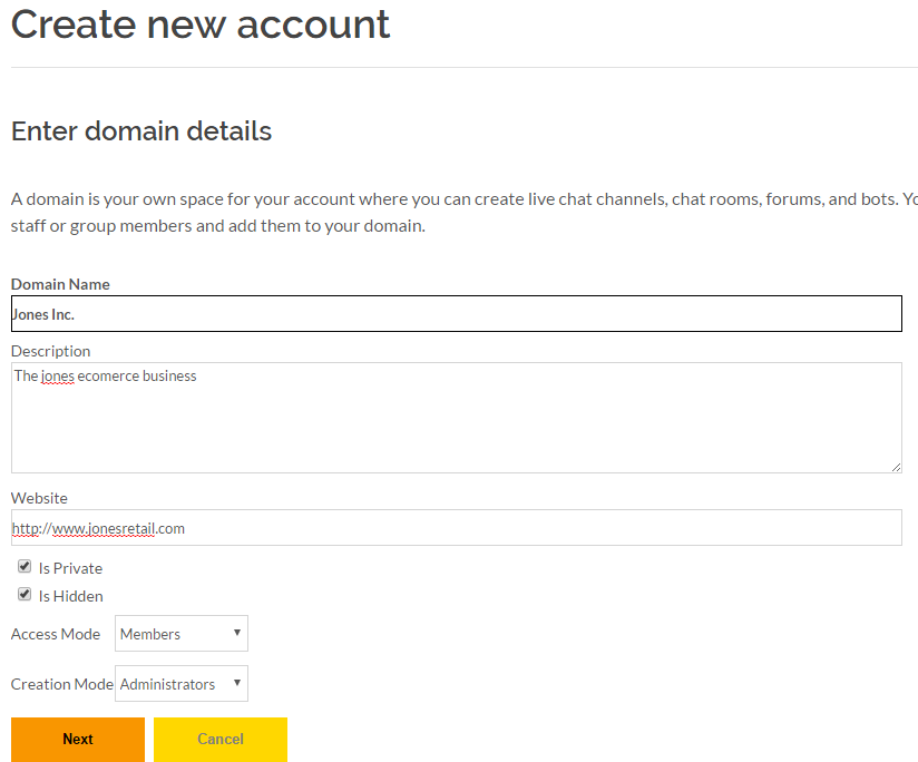 Step 3 - Create DomainThe account wizard will next take you to your domain setup. A domain is just your account directory, where you will be able to create bots and other content. Enter your domain's name (i.e. your business's name) and click Next.